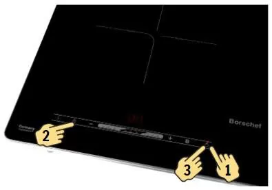 Để tăng nhanh quá trình nấu, bạn có thể ấn vào biểu tượng Booster phía cuối thanh nhiệt độ. Chức năng Booster cho phép bếp từ Borschef sử dụng công suất lên đến 3000W.